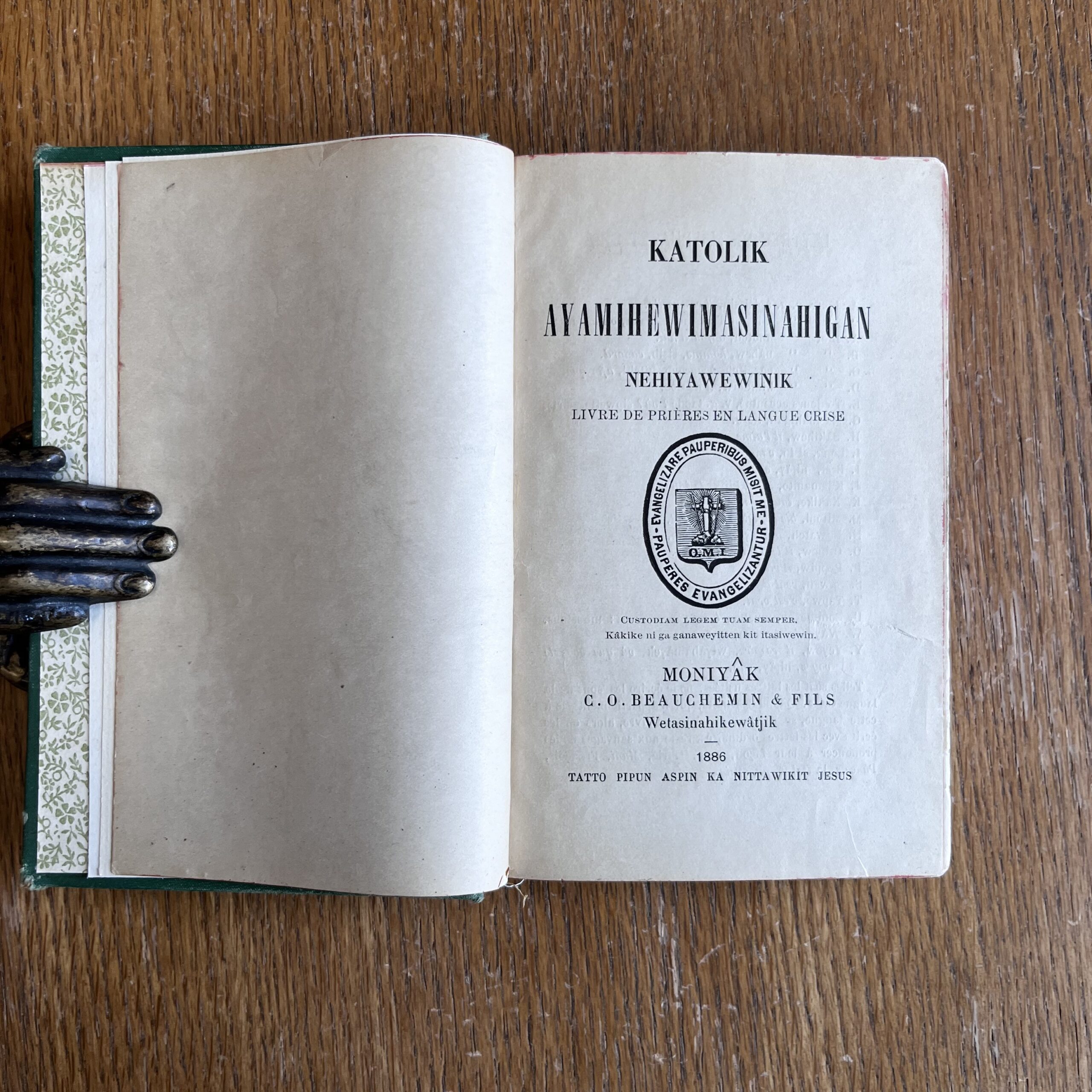 Lacombe, Albert . Katolik ayamihewimasinahigan nehiyawewinik: Livre de prières en langue crise /with/ Petit manuel pour apprendre à lire la langue crise: Small manual to learn the reading in the Cree language. Montreal [Moniyak]: C.O. Beauchemin & Fils, 1886. pp. 295, 43. 12mo. Green cloth with gilt lettering to spine and embossed decorations to boards. Red page edges, patterned endpapers. Edgewear, some spotting to covers, one-inch tear to edge of title page and p. 23 of second title, a few grubby fingerprint marks, spine sound; very good-.