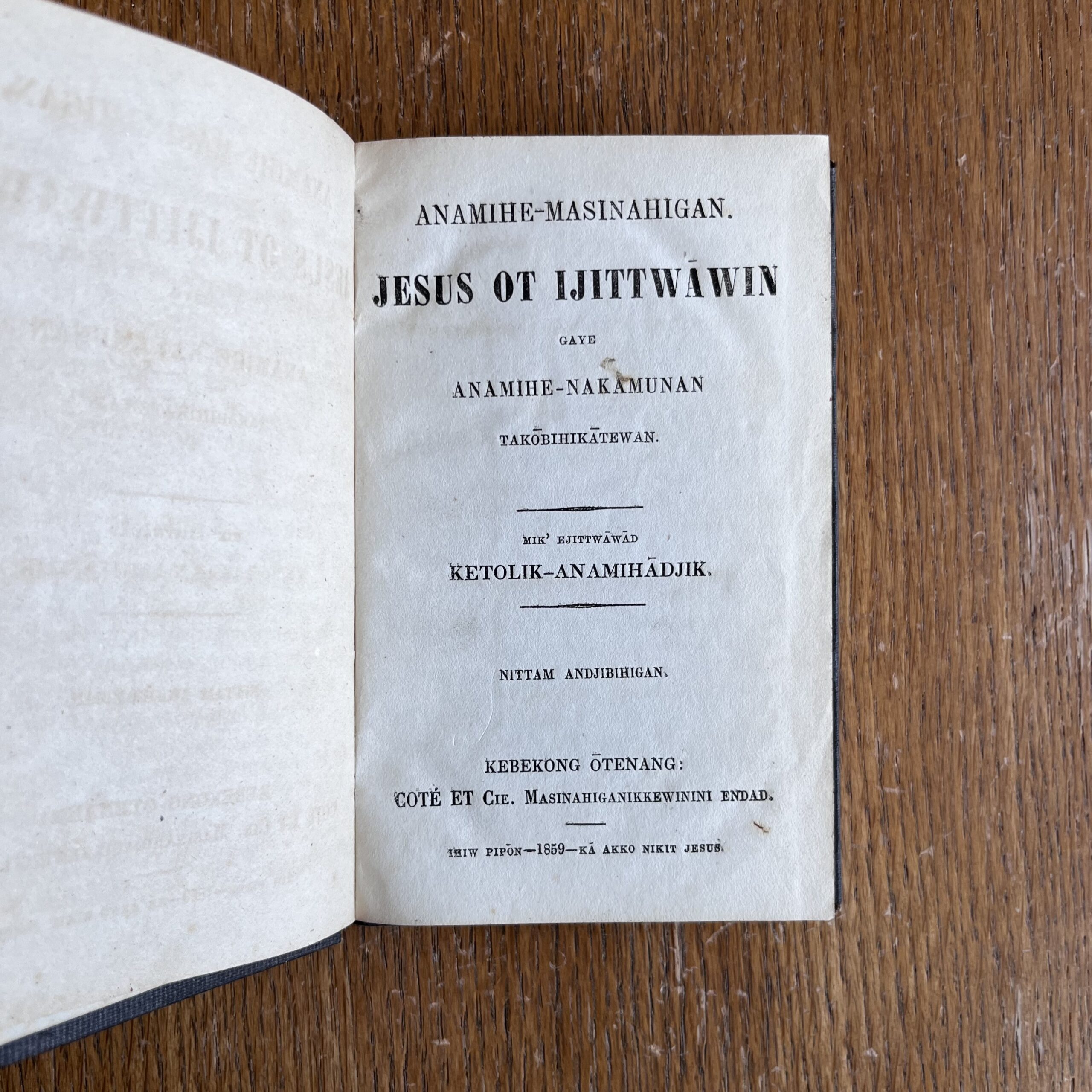 [Belcourt, Rev. George Antoine, also Bellecourt]. Anamihe-Masinahigan. Jesus Ot Ijittwawin gaye anamie-nakamunan takobihikatewan. Mik’ Ejittwawad Ketolik-Anamihadjik. Kebekong [Quebec] otenang: Cote et Cie Masinahiganikkewinini Endad, 1859. Second edition. pp. vi, 209. 12mo. Plain brown cloth binding, page edges speckled. Minor rubbing to boards, binding sound, contents clean; remarkably nice condition.
