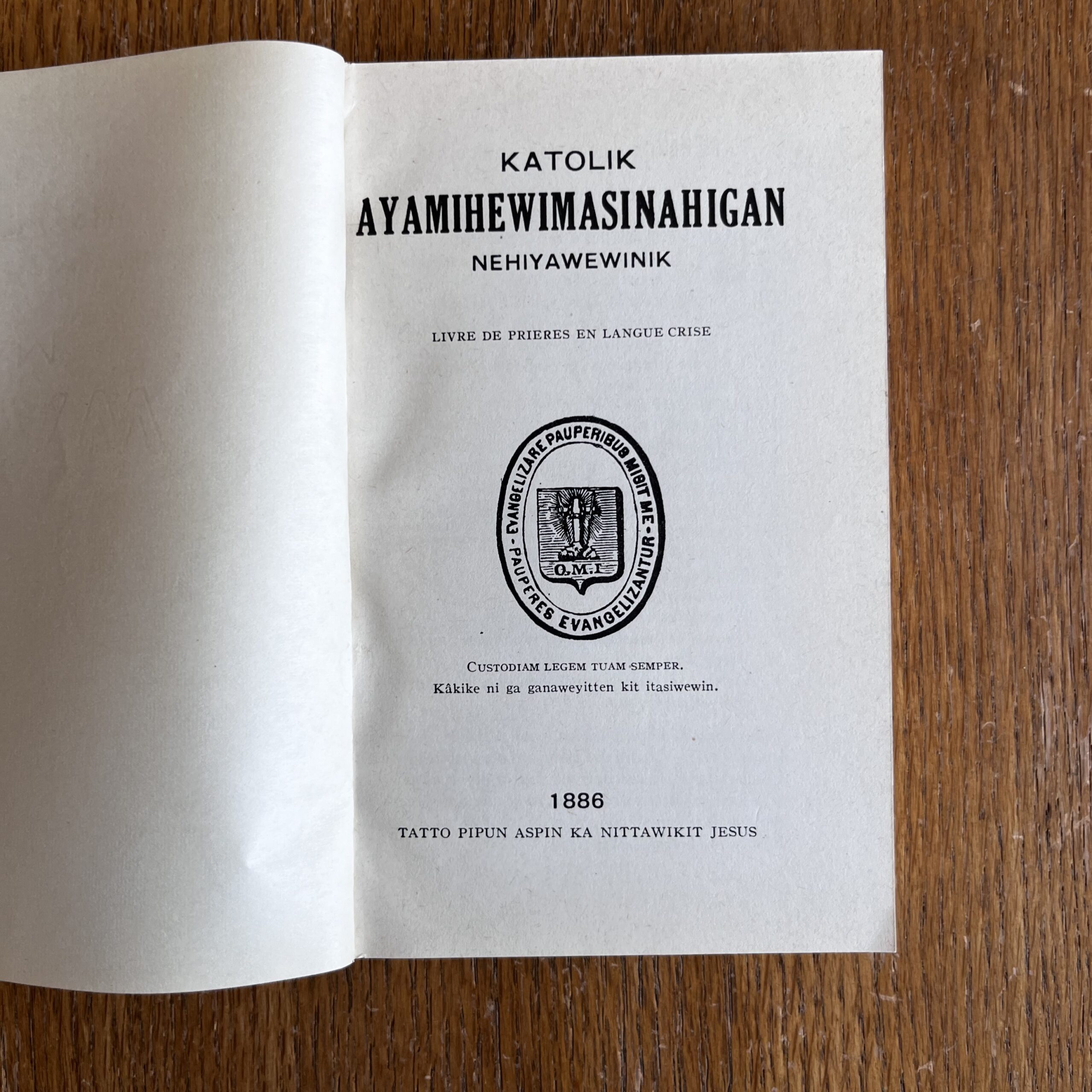 An anonymously printed, undated, unrecorded according to my searches, but likely early 20th century reprint of the 1886 edition, with the same contents and pagination but a different title page and paper stock. Peel 1622 (1822 ed): “Catholic prayers and hymns, with a catechism and texts for religious instruction. Petit manuel pour apprendre à lire la langue crise (43 pages at end) has a separate title-page and was also published separately… Initial 295 pages in Cree with some French text; terminal 43 pages in Cree, French, and English. Picture captions in Ojibway and French.”