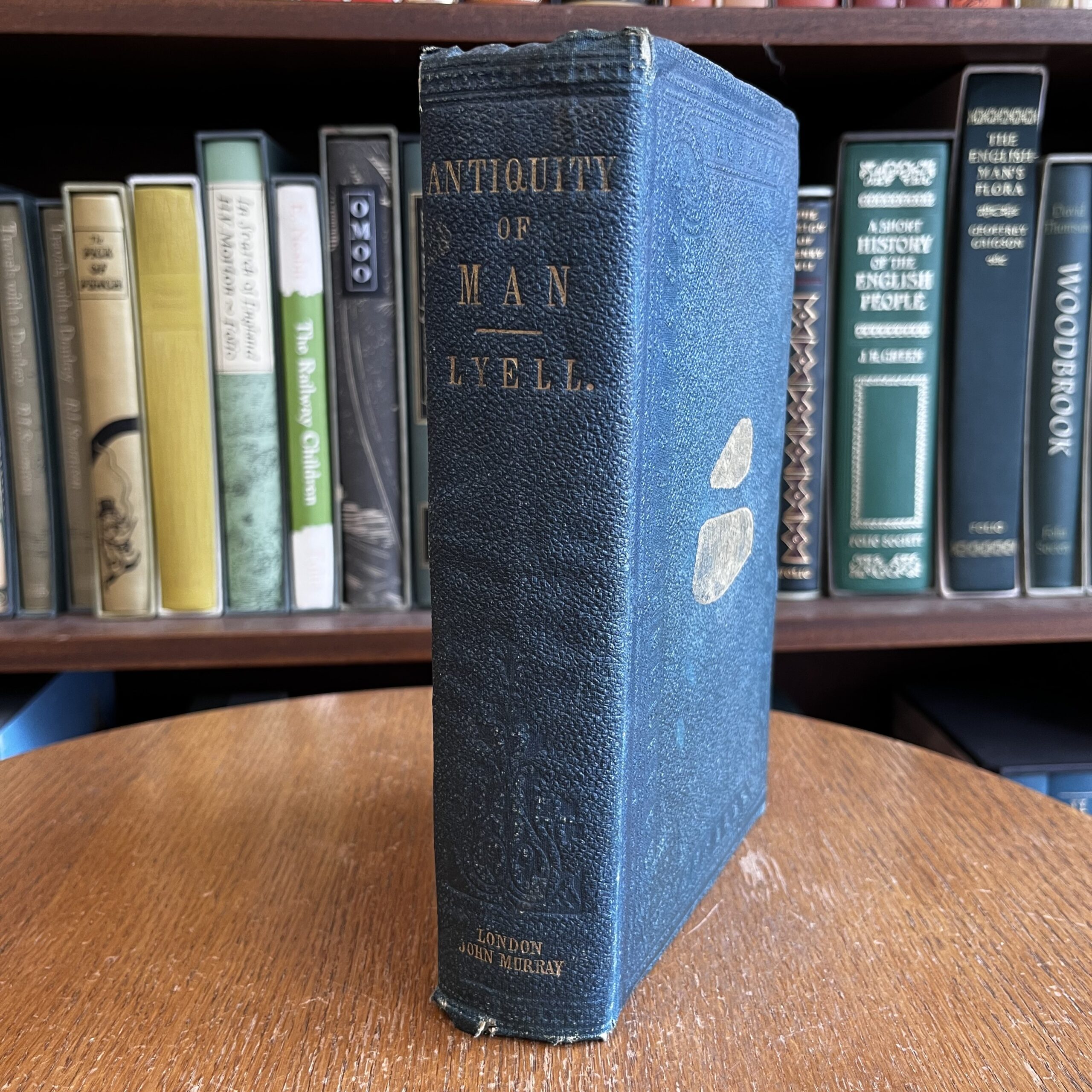 Lyell, Sir Charles. The Geological Evidences of The Antiquity of Man With Remarks on Theories of The Origin of Species by Variation. London: John Murray, 1863. First edition. pp. xii, 520, 32 (ads). 8vo. Embossed teal cloth with gilt lettering to spine, and gilt illustration to front board. Illustrated with figures, and woodcuts including a frontispiece and maps.