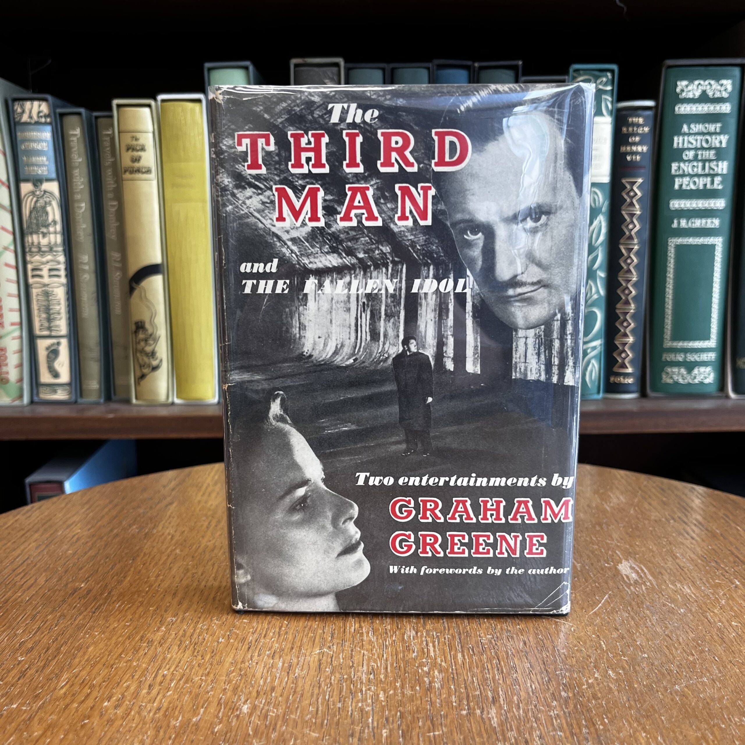 Greene, Graham. The Third Man and The Fallen Idol. London: William Heinemann Ltd, 1950. First edition. pp. 188. 8vo. Black cloth with silver lettering to spine. Very slight shelfwear, tiny ink dot to bottom page edge, internally clean, binding sound; remarkably crisp. Unclipped dustjacket shows rubbing, a few small chips and tears at edges, and a tide mark to verso.