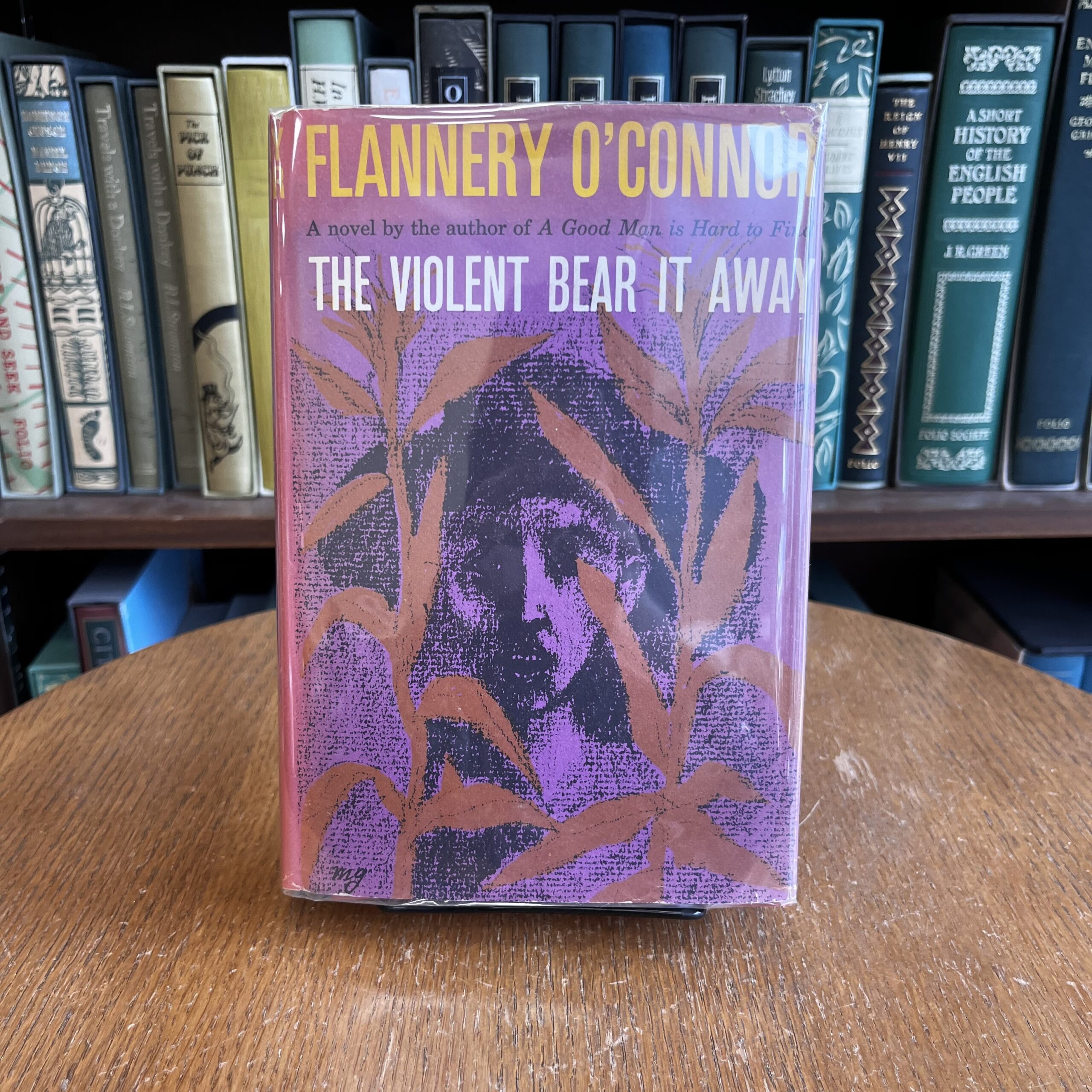 O’Connor, Flannery. The Violent Bear it Away. New York: Farrar, Straus & Cudahy, 1960. First edition. 8vo. Grey spine over red boards. Corners bumped, top of spine slightly sunned; very good-. Dustjacket shows a clipped front flap, some sunning, rubbing to rear panel, a few small chips to edges.