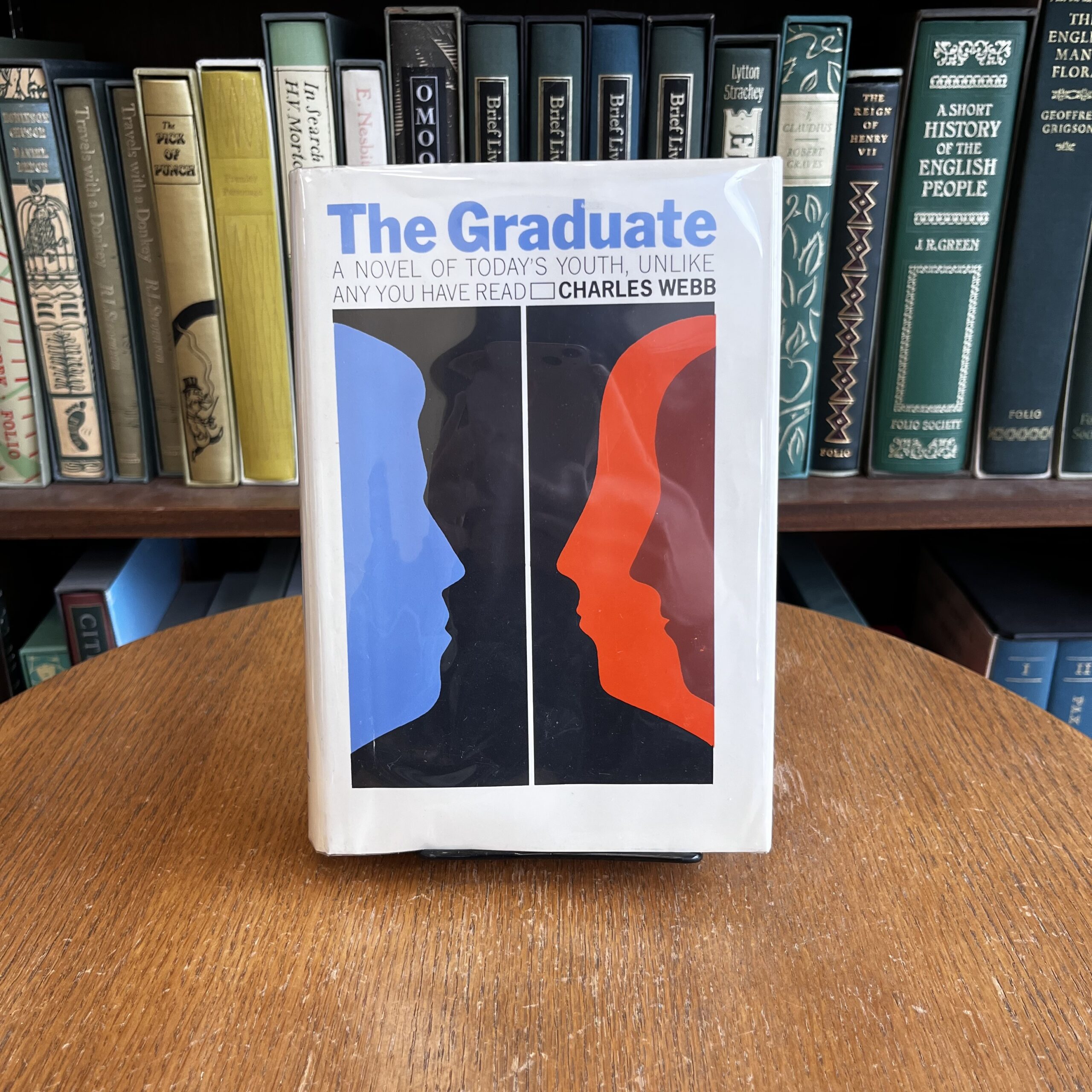 Webb, Charles. The Graduate. New York: New American Library, 1963. First edition. pp. 238. 8vo. Navy cloth spine, over striped boards. Publisher’s red topstain. Spine slant, front board slightly bowed, ffep excised, scuff to half-title. Unclipped jacket shows a sunned spine and minor rubbing.