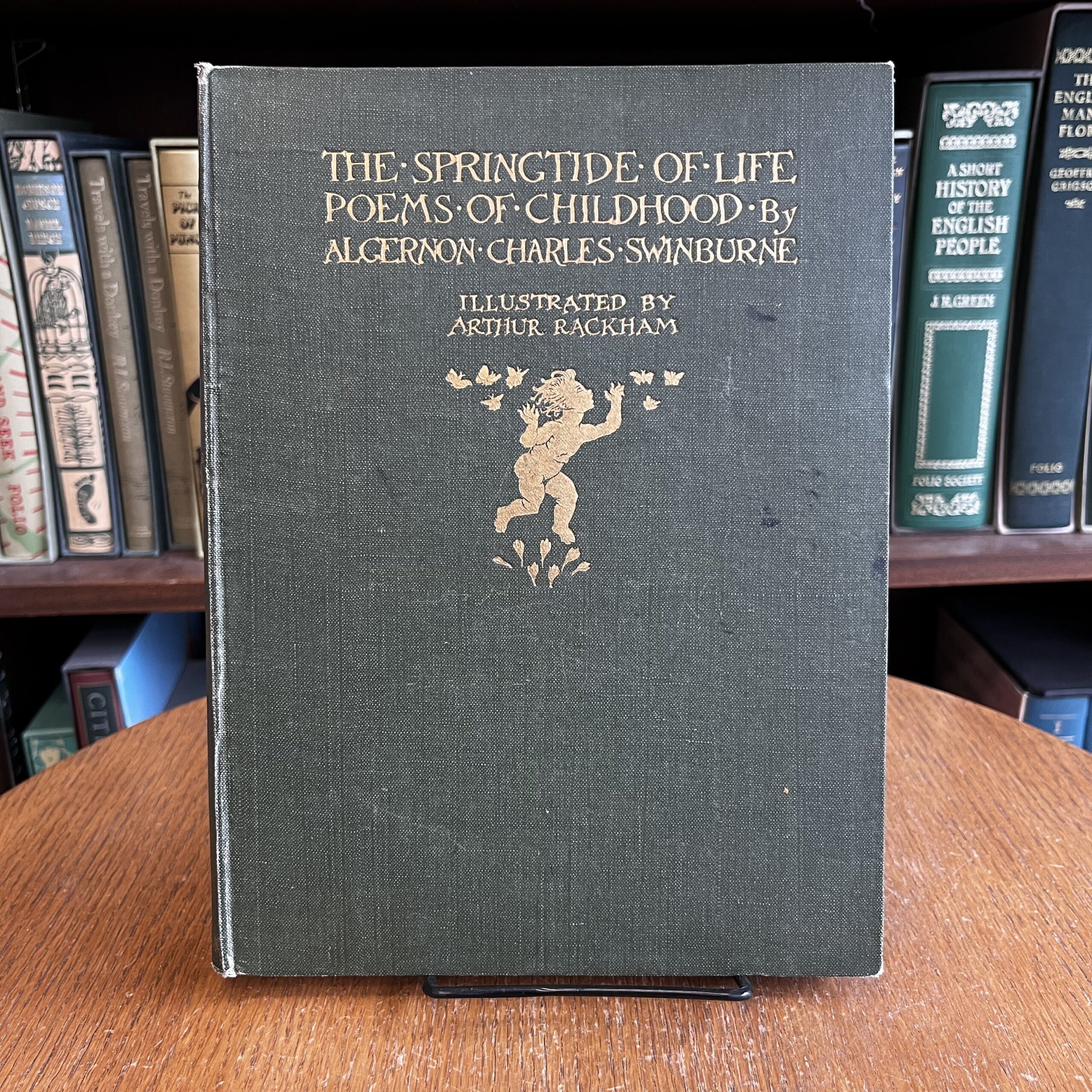 Swinburne, Algernon Charles; Edmund Gosse. The Springtide of Life Poems of Childhood. London: William Heinemann, 1918. pp. 132. 4to. Bound in green cloth with gilt lettering and decoration to spine and front board. Decorated endpapers. Black and white Arthum Rackham illustrations and colour plates. Light shelfwear, some scuffing and spots to extremities, ink inscription to front pastedown, single instance of underlining; very good.