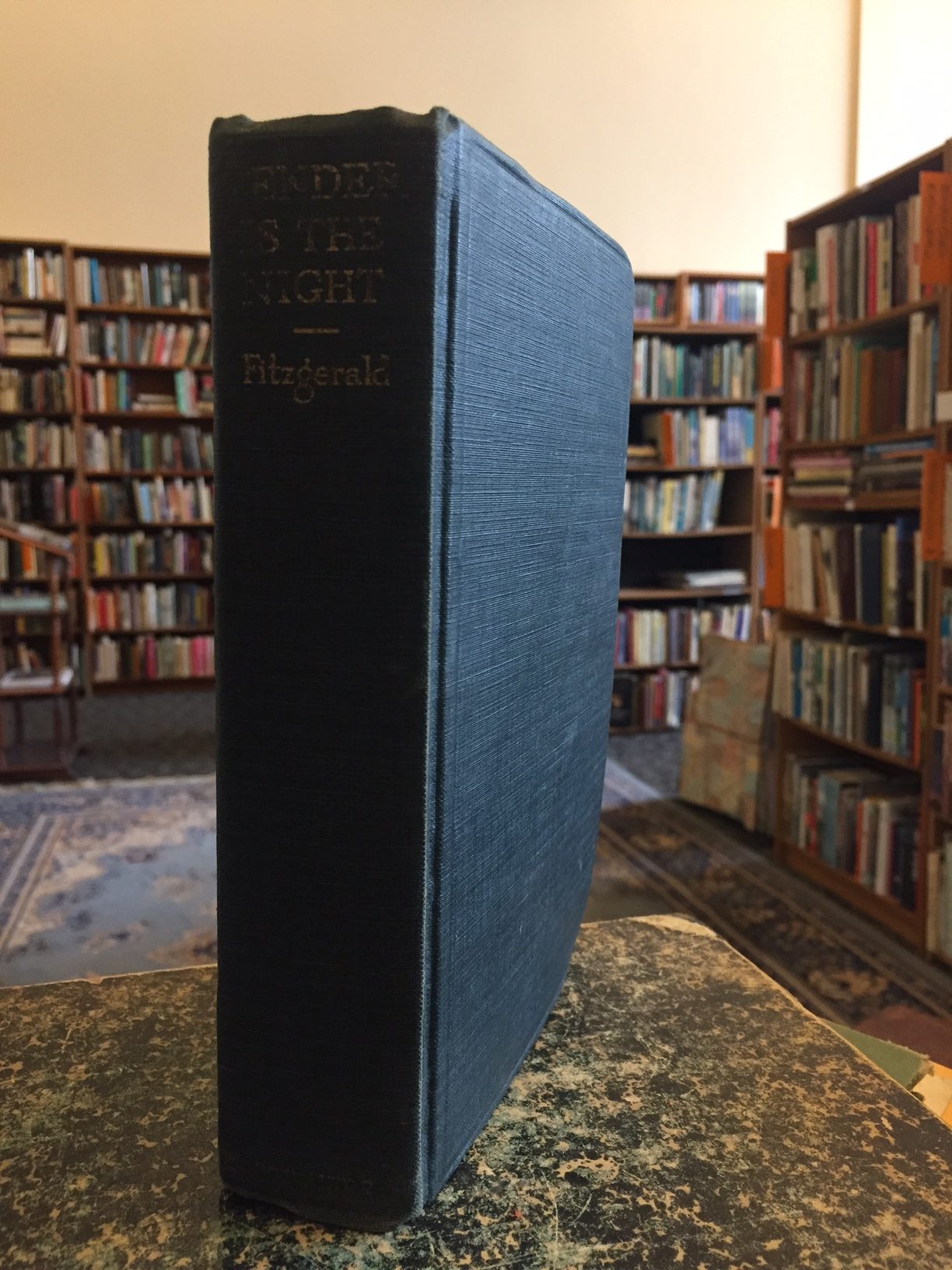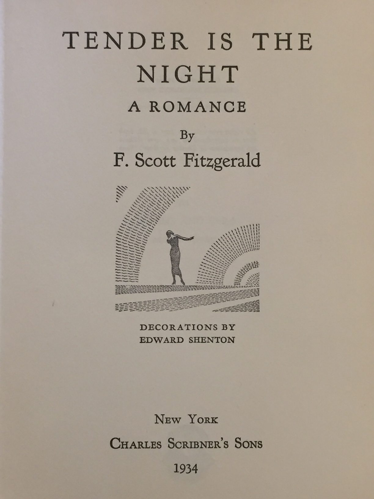 Fitzgerald, F. Scott. Tender is the Night: A Romance. New York: Charles Scribner’s Sons, 1934. First edition. 8vo. pp. 408. Dark bluish green cloth binding with gilt lettering to spine. Top and bottom edges trimmed. Pen and ink drawings by Edward Shenton. Some rubbing to binding, slight curve to front board, spotting to bottom page edge, binding sound; very good-. In facsimile dust jacket. Hardcover.