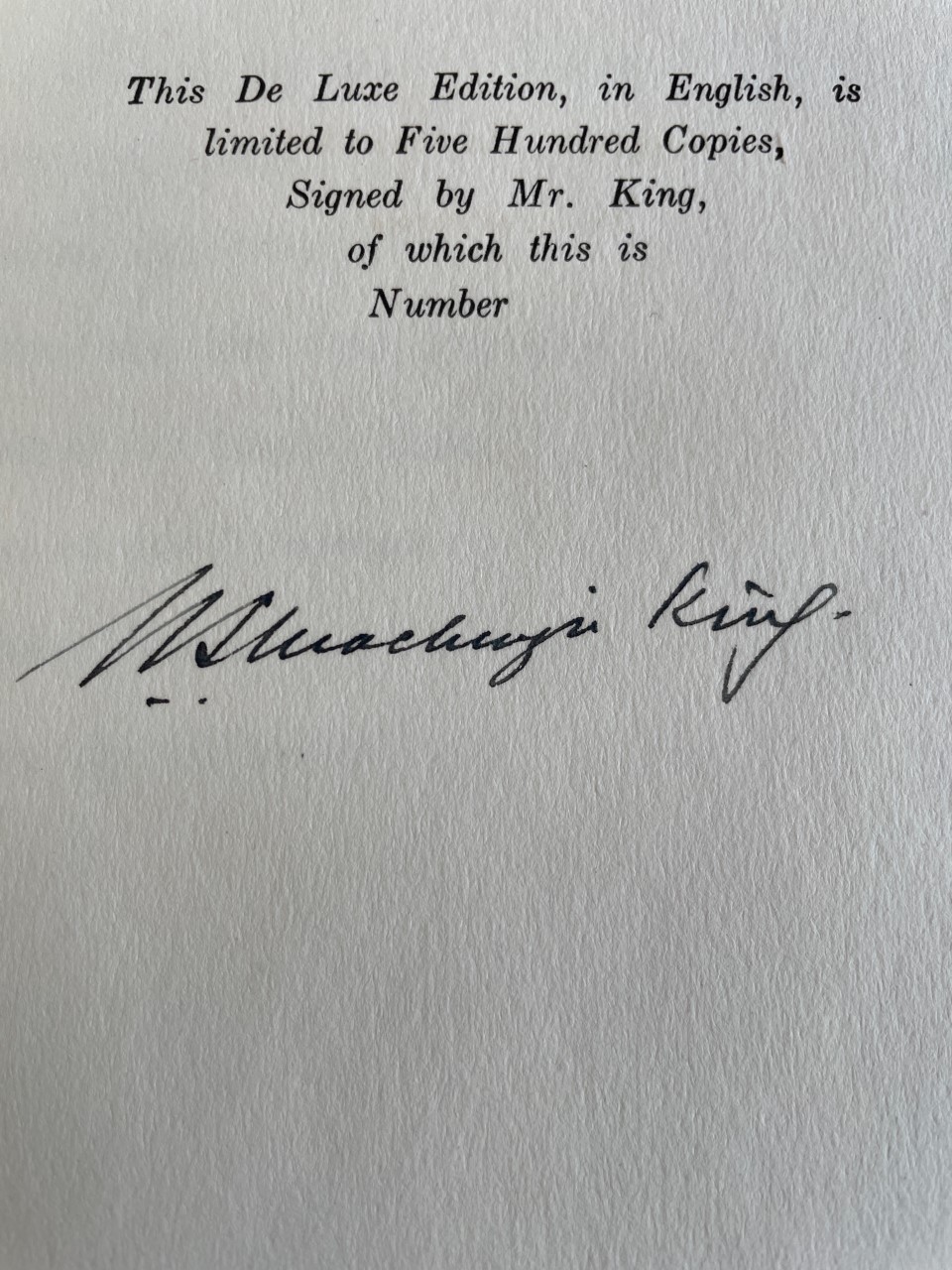 Lewis, John. Mackenzie King The Man; his Achievements. Toronto: Morang and Company, 1925. Limited edition. pp. 139. 8vo. Bound in maroon leather with gilt lettering and gilt portrait to front board, uncut page edges, SIGNED by Mackenzie King. Light shelfwear, small indent and scuff to spine; very good- in good slipcase showing scuffs, and clear tape to edges. Hardcover.