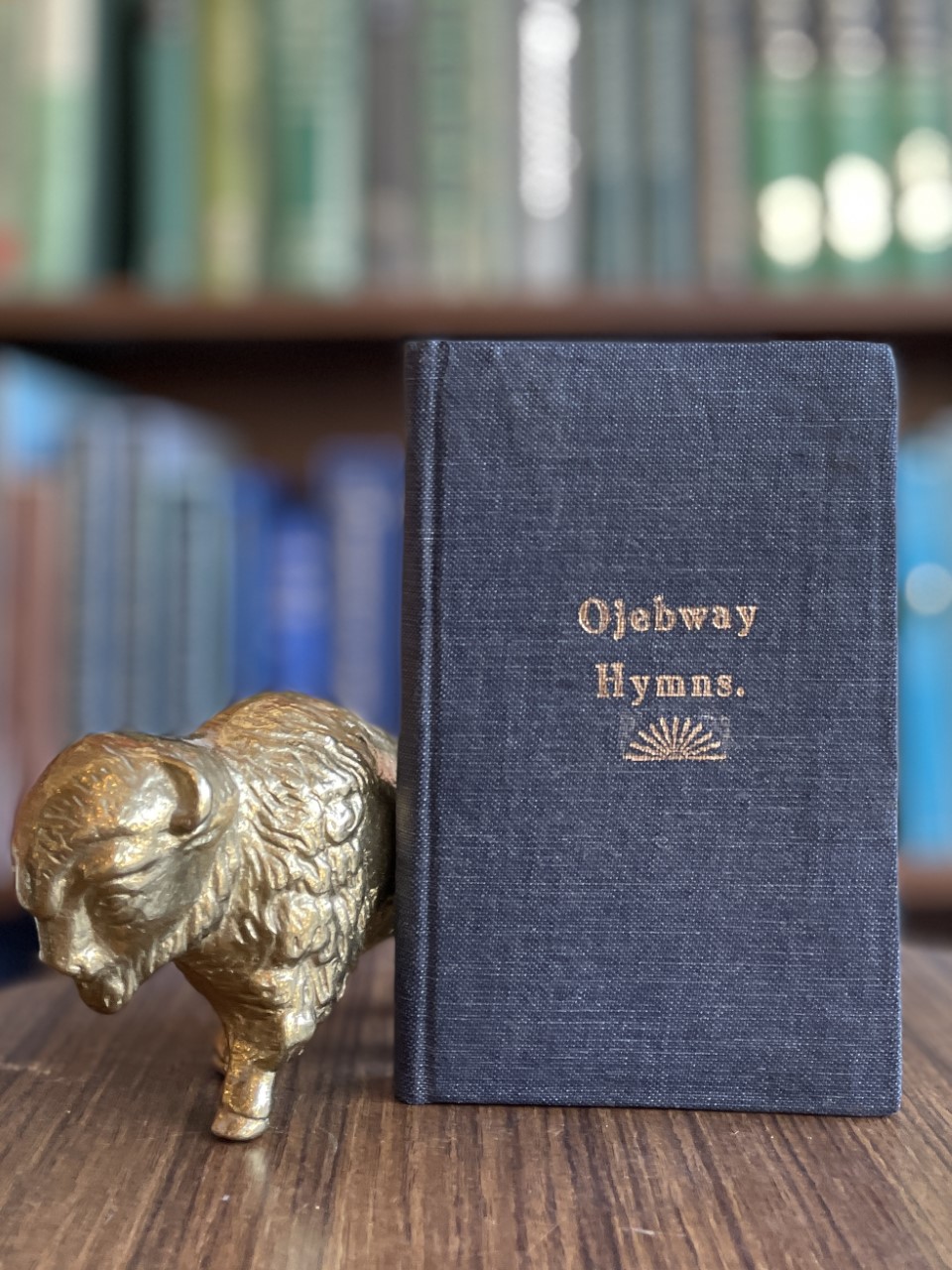 Jones, Peter, trans., with James Evans, George Henry. A Collection of Ojebway and English Hymns, for the use of the Native Indians / Ojebway nuhguhmonun, kanuhnuhguhmowahjin egewh uhneshenadbaig. Toronto: Methodist Missionary Society at the Methodist Conference Office, 1877. Reprint. pp. vi, 234. 12mo. Newer navy cloth binding with gilt lettering and decoration to front board. A few small rubber stamps (United Church), contents clean, binding sound. Hardcover.