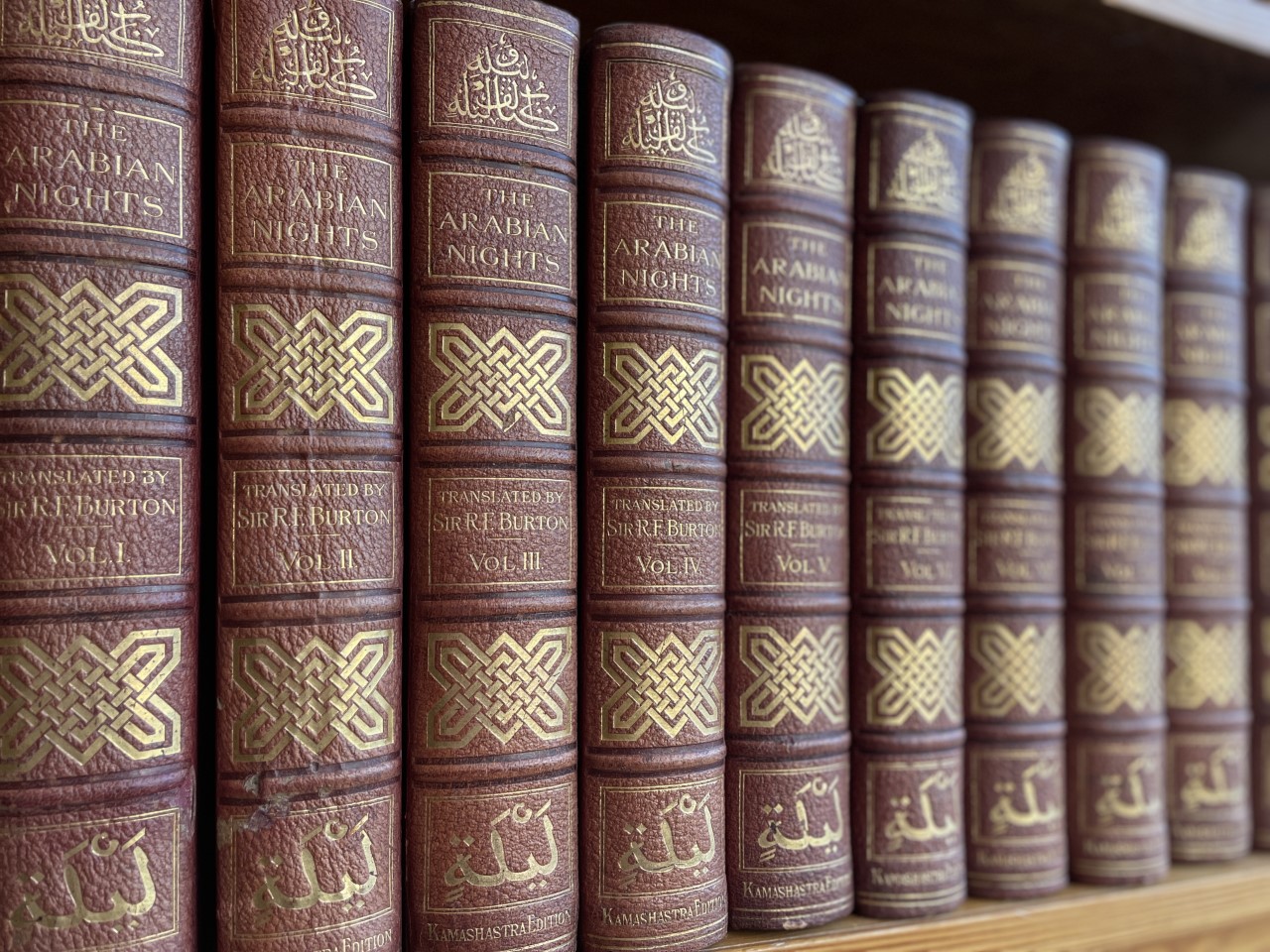 Burton, Captain Sir Richard Francis; Albert Letchford; Leonard C. Smithers (Ed.). The Book of a Thousand Nights and a Night. London: H.S. Nichols Ltd., 1897. A set of twelve quarto volumes (26 x 18 cms), each uniformly-bound in 3/4 wine-red leather over woven green cloth, with marbled endpapers and the top edges gilt. All volumes remain tightly-bound, with minor evidence of rubbing to the extremities. Each volume carries a rather nice bookplate of J. H. Burton, depicting a schooner in full sail bordered by mermaids. The bookplate is initialled “HN” (Harold Nelson, famed British bookplate designer, artist, and engraver). Internally, all volumes are in excellent condition and appear to have been seldom read or even opened. The words “Kamashastra Edition” appear at the bottom of the spine of each volume. Leather Bound.