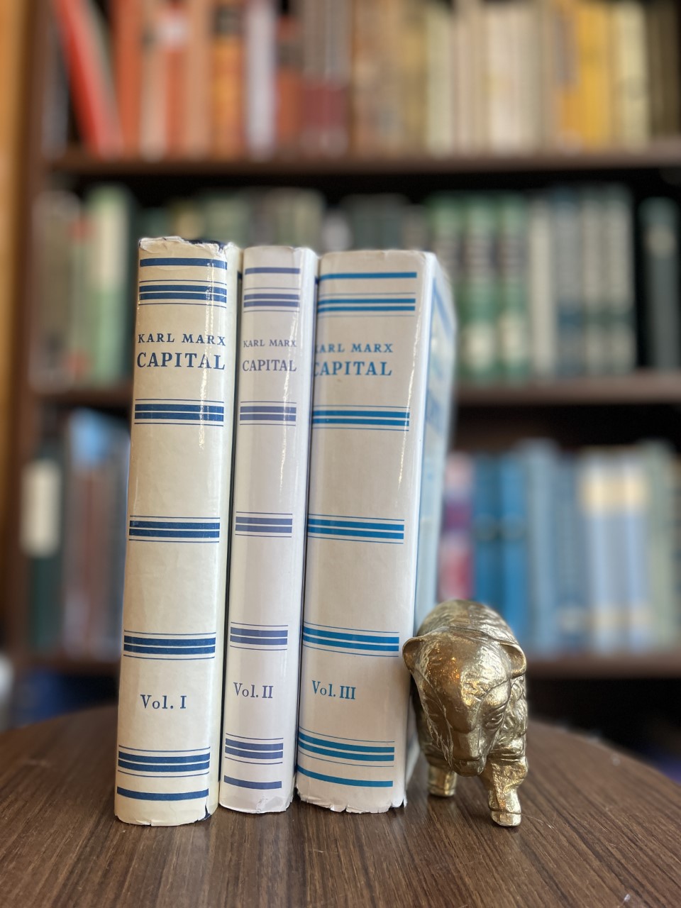 Marx, Karl; Samuel Moore and Edward Aveling (trans.). Capital: A Critique of Political Economy. (Three Volume Set) Moscow: Progress Publishers, 1983. pp. 767, 551, 948. 8vo. Bound in blue cloth with gilt lettering to spines. All volumes lightly shelfworn, with ink inscriptions to ffeps. Volume 1 slightly shaken, with bumped corners and sparse underlining and marginalia in pencil throughout. Volume 3 slightly shaken. All three dustjackets with nicks and tears to edges. Volumes 1 and 2 dustjackets have been corner-clipped, Sunning, predominantly to Volume 1 and 3, but also to spine of Volume 2; very good. Hardcover.